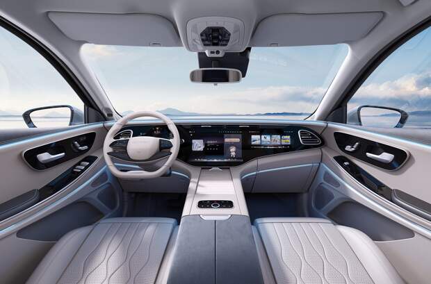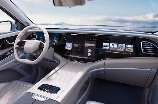Обновленный Exeed VX с тремя рядами сидений визуально идентичен прошлогоднему пятиместному кроссоверу, отличается разве что декор. Основные изменения пришлись на салон. Там появился цифровой кластер, который напоминает экран Hyperscreen на «Мерседесе» EQS. Общая у них, скорее, архитектура с массивной стеклянной панелью во всю ширину, но реализация заметно отличается.