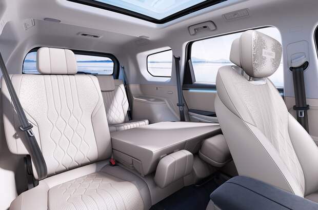 Руль — с сенсорными кнопками. Рычажки управления электроприводом сидений, опять же, как у Mercedes-Benz, расположены на дверях. Передние сиденья оснащены обогревом, вентиляцией и массажем. На втором ряду есть подогрев/вентиляция, на третье — электропривод складывания спинок. Новшество, доступное топ-версиям VX, — активная система шумоподавления. Наконец, заявлено новое исполнение с посадочной формулой 2+2+2.