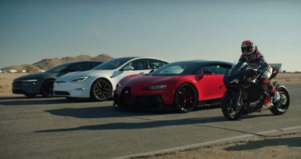 Ну а на десерт их свели с супербайком Ducati Panigale V4 SP2.Тема гонок по прямой с участием электромобилей кажется практически неисчерпаемым инфоповодом для видеоблогеров, что подтверждает очередной ролик от авторов YouTube-канала Hagerty. Но на сей раз блогеры не стали мелочиться и собрали соревнование с участием двух мощнейших электромобилей мира — Lucid Air Sapphire и Tesla Model S Plaid — оппонентом для которых стал один из самых мощных гиперкаров с традиционным двигателем внутреннего сгорания, Bugatti Chiron Pur Sport. Ну а на десерт их свели с супербайком Ducati Panigale V4 SP2.