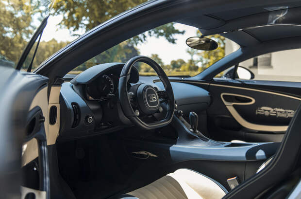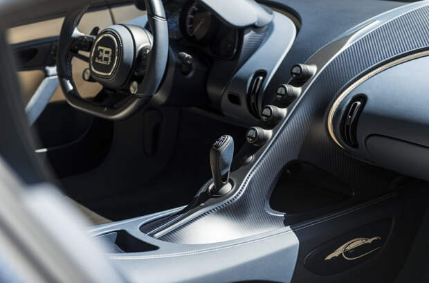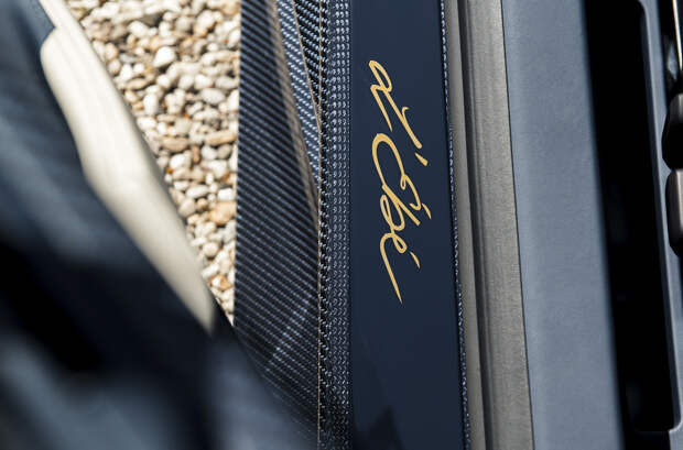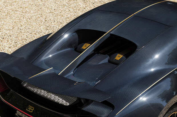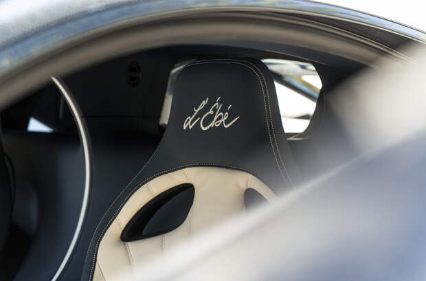 Изгибы темно-синего карбонового кузова Chiron L'Ébé подчеркнуты золотыми линиями, которые перекликаются с оформлением колесных дисков и шильдиками Bugatti. В том же оттенке выполнены обводка фирменной радиаторной решеткой в форме подковы, а также детали крышки восьмилитрового W16. На нижней стороне антикрыла спрятано название версии курсивом — L'Ébé, им также отмечены пороги и расшитые вручную спинки сидений.