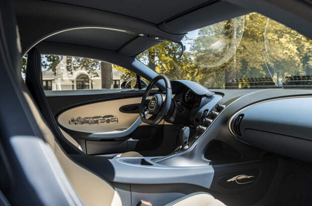 Любопытная деталь — изображения самых знаковых автомобилей Bugatti на каждой двери, от ранних гоночных моделей до современных гиперкаров.
