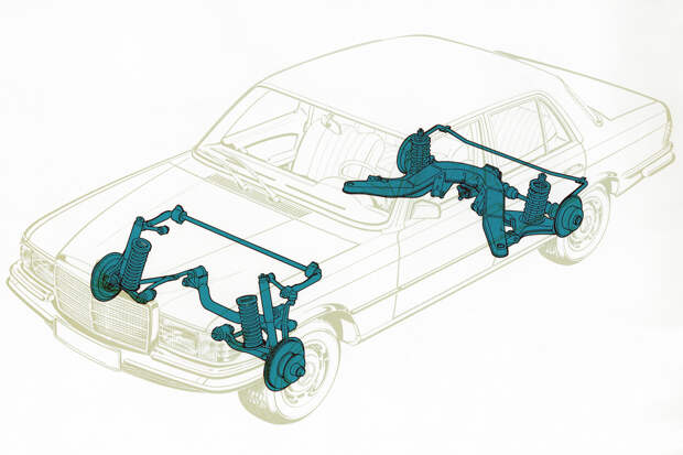 Если на старых машинах серии W108 нижние рычаги целиком крепились к прочному подрамнику, то на новом седане его сократили до небольшой балки. В каком-то смысле это был шаг назад: в эту балку упирались лишь задние крепления нижних рычагов, а передние концы были закреплены непосредственно на кузове. Верхние рычаги сделали составными — причём роль продольных тяг выполняли плечи стабилизатора поперечной устойчивости, установленного на моторном щите, почти под лобовым стеклом: очень экзотическое решение.