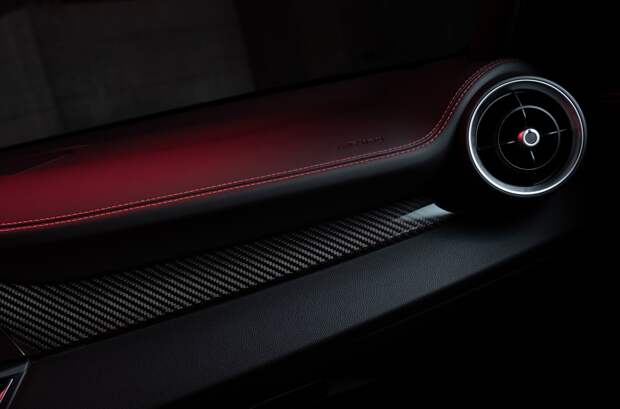 Салон — тоже с претензией на спортивность: тут и декоративные накладки из карбона, и алькантара на сиденьях, и обилие красной прострочки.
