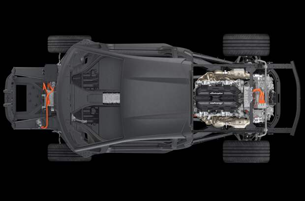 Это монокок, практически полностью сделанный из композитов. Он на 10 процентов легче шасси Aventador. Статическая жесткость на кручение — 40 000 Нм/град, на 25 процентов больше, чем у предшественника. Для сравнения: у Koenigsegg Jesko — 65 000 Нм/град, у Bugatti Chiron — 50 000 Нм/град.