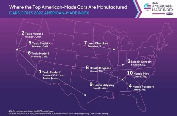 В индексе American-Made сайта «Cars.com» модели ранжируются по их «американистости». В зачет идут место сборки автомобиля, состав деталей, происхождение двигателя и трансмиссии, а также рабочей силы. В рейтинг 2022 года включены машины, выпускаемые на территории США. Их 95 штук. В первой десятке — все модели Tesla, причем прошлогодний победитель Model 3 теперь расположился на втором месте.