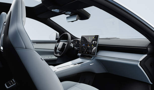 Салон, как и у других моделей Polestar, оформлен в духе минимализма. На передней панели — приборный экран (10,2 дюйма), тачскрин медиасистемы (15,4 дюйма) и проекционный дисплей (14,7 дюйма), а физических кнопок почти нет. Зато есть… салонное зеркало заднего вида. Невзирая на отсутствие заднего стекла, это именно зеркало со встроенным экраном, на который передается картинка с задней камеры на крыше. Видеотрансляцию можно отключить, и тогда через зеркало можно, например, наблюдать за детьми на заднем сиденье.