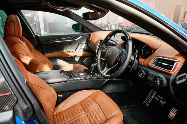 Оснащённый 580-сильным 3,8-литровым V8 производства Ferrari седан Ghibli Trofeo окрашен в цвет Blu Inchiostro и получил отделку салона коричневой кожей Couio Tan Pieno Fiore, которая контрастирует с углепластиковыми декоративными панелями.