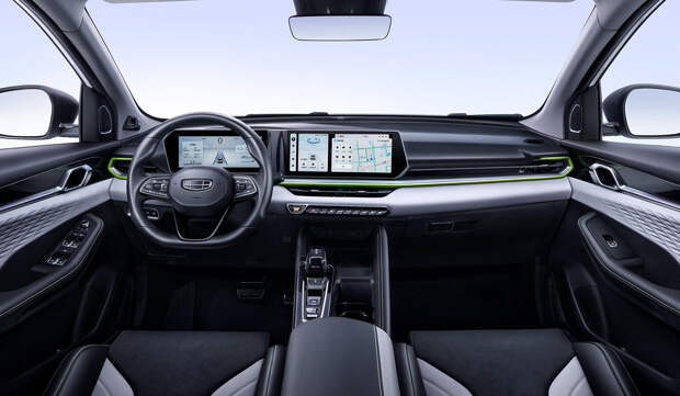 Салон полностью новый — и, увы, лишенный части оригинальных решений, отличавших прежний Coolray. Например, упразднен геометрический дизайн центрального тоннеля, а ручки отпирания дверей больше не объединены с рукоятками. Приборный экран (10,25 дюйма) теперь без козырька и визуально объединен с дисплеем медиасистемы (12,3 дюйма). Установлен новый селектор трансмиссии, появился беспроводной зарядник для гаджетов.