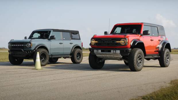 И сейчас специалисты, известные своими сверхмощными автомобилями на базе самых разных моделей, решили наглядно продемонстрировать разницу в потенциале заводского Ford Bronco Raptor и собственного Hennessey VelociRaptor 400 Bronco.В начале 2022 года состоялась премьера внедорожника Ford Bronco Raptor, который стал самым мощным серийным вариантом модели. Но ещё до выхода этого автомобиля американское тюнинг-ателье Hennessey Performance из штата Техас представило новый проект на базе стандартного внедорожника — взяв за основу Ford Bronco с 2,7-литровым V6, тюнеры превратили его в модель VelociRaptor 400. И сейчас специалисты, известные своими сверхмощными автомобилями на базе самых разных моделей, решили наглядно продемонстрировать разницу в потенциале заводского Ford Bronco Raptor и собственного Hennessey VelociRaptor 400 Bronco.
