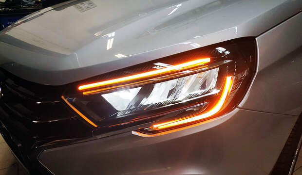 Итак, что изменилось? Новые бамперы прибавили по полтора сантиметра к длине машины, фирменный «икс-фейс» слегка изменил выражение, а новая решетка радиатора различается у обычных и кроссовых версий. Фары и противотуманки теперь полностью светодиодные — с красивым рисунком поворотников в стиле Renault, хотя анимации у Лады нет. Сколько будет стоить такая фара в отделе запчастей, менеджеры пока не знают, но уверяют, что без запчастей будущие владельцы не останутся.