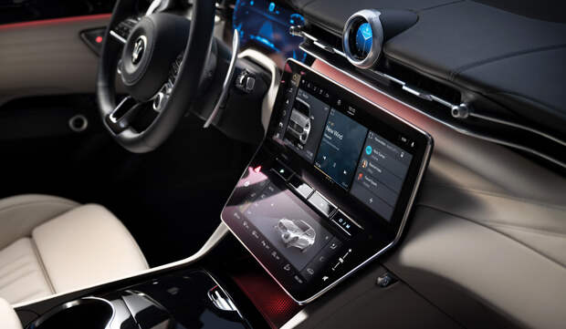 Часы на макушке передней панели цифровые (впервые для Maserati): помимо привычного циферблата, этот экранчик может отображать компас, хронометр и индикатор ускорений, а также визуализировать голосового помощника. Кроме того, отдельный экран диагональю 6,5 дюйма есть на заднем ряду (для третьей зоны климат-контроля), а за доплату предложен проекционный дисплей перед водителем.