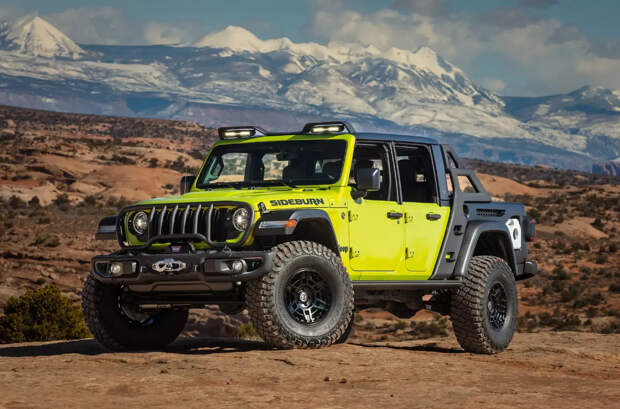В свою очередь пикап Jeep Gladiator Rubicon Sideburn Concept похвастается увеличенным дорожным просветом и оригинальным кузовом, в котором поместятся многочисленные канистры, внедорожная утварь и походный скарб.