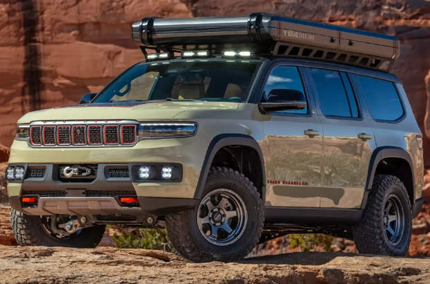 Кемпер Grand Wagoneer Overland Concept предложит новую схему установки раскладной палатки: в неё можно попасть не только с улицы, но и из салона, хотя для этого пришлось переделать одну из секций панорамной крыши.
