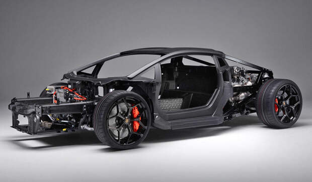 Купе имеет новый углепластиковый монокок, для которого придуман термин «монофюзеляж». Ключевое отличие от Авентадора — композитный передний подрамник: он сделан из короткого углеволокна, пропитанного смолой, и получился на 20% легче и вдвое жестче прежней алюминиевой конструкции. В целом новый кузов на 10% легче, чем у Авентадора, а жесткость на кручение выросла на 25%, до 40000 Нм/град.