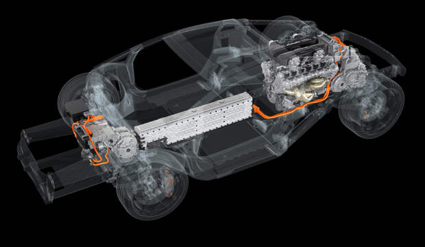 В центральном тоннеле вместо карданного вала теперь расположен литий-ионный тяговый аккумулятор массой 70 кг. Его емкость невелика (3,8 кВт∙ч), зато он имеет высокие показатели энергообмена. Зарядить батарею можно заранее от розетки: предусмотрено бортовое зарядное устройство мощностью 7 кВт. Но главное, что отказ от механического привода передних колес вылился в новую компоновку заднего силового модуля.