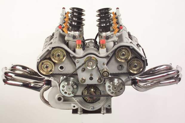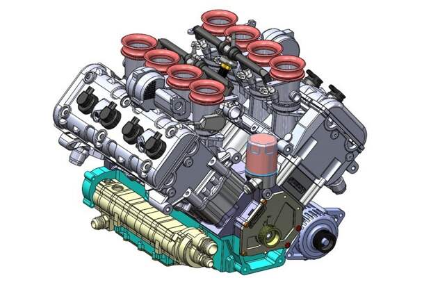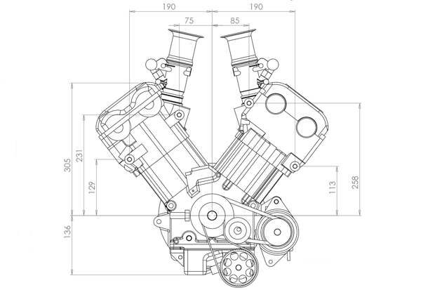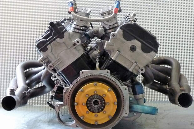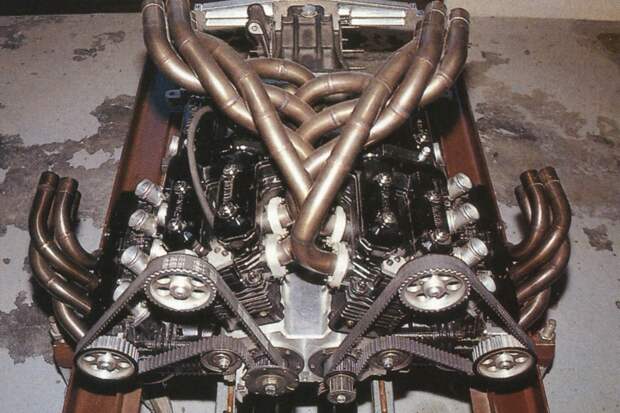 Впрочем, его творение было совсем не похоже на вейроновский мотор. Чтобы вам было проще разобраться, представьте себе два двигателя V8 на базе спортбайковских «четвёрок» — любой из нашей статьи. А теперь мысленно уложите один V8 на левый бок, второй на правый, и объедините их в одном картере. Именно так выглядела конструкция Хименеса — это были буквально два мотора в одном корпусе: даже коленвалов было два!