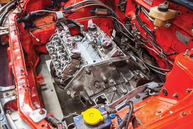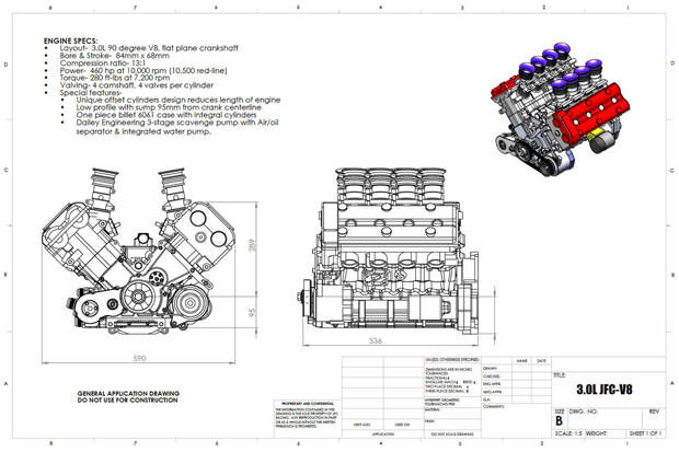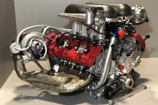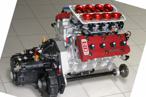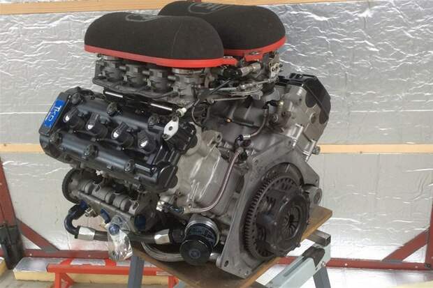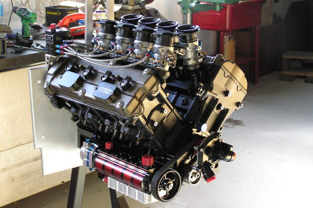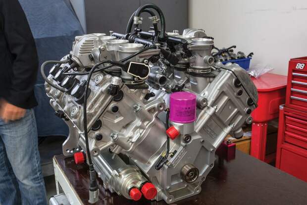 За основу были взяты головки и блоки цилиндров от супербайка Kawasaki ZX-12R. Скомпоновано всё классически для моторов такого рода — с двумя цепями привода ГРМ, спереди и сзади. Угол развала традиционный для V8 — 90 градусов. Картер двигателя и крышку коренных опор коленвала вырезали из цельных кусков алюминия на многокоординатном станке с программным управлением. Такой двигатель на стандартных распредвалах и системе впуска сразу же показал 360 лошадиных сил и «крутился» до 11,6 тысяч оборотов в минуту.
