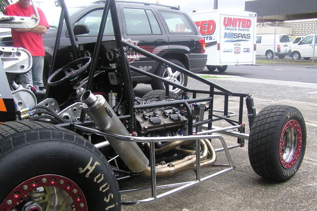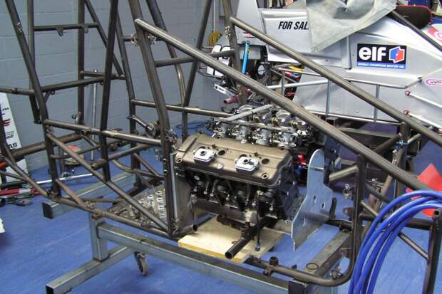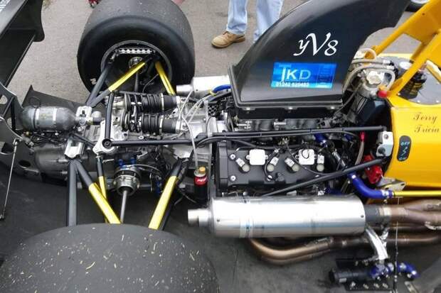 Хотя про своеобразный привод ГРМ упомянуть стоит: распределительные валы приводились по-мотоциклетному, центрально расположенной цепью. Причём за счёт нехитрого реверсного механизма распредвалы в одной головке вращались в обратную сторону — чтобы можно было использовать серийные ямаховские детали. Двухлитровый двигатель весил всего 73 килограмма и выдавал 302 лошадиные силы на стандартных мотоциклетных карбюраторах. Кстати, в 2003 году за такой мотор просили 14 тысяч фунтов стерлингов — сравнительно недорого.