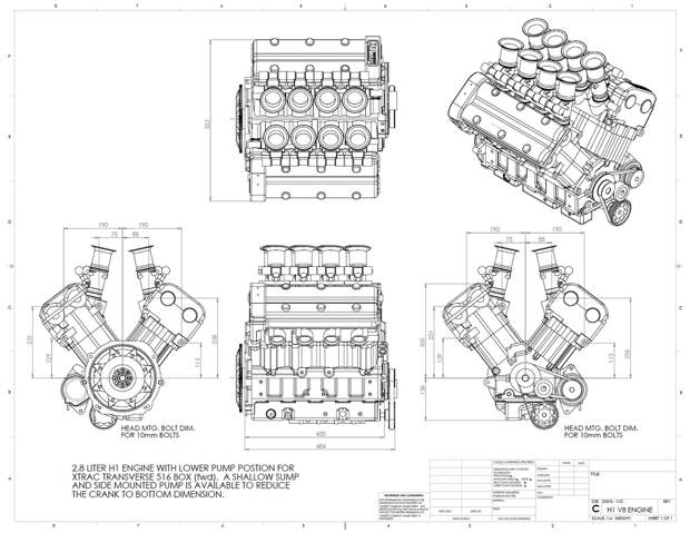 Выбирая угол развала, Прентис ориентировался на максимальную компактность. «Мы бы даже предпочли 71 градус, если бы в таком виде удалось скомпоновать мотор» — объяснял он. Стальной коленвал производства Arrow Precision — «плоской» конструкции, с шатунными шейками в одной плоскости. Это придаёт мотору более «крутильный» характер и позволяет использовать стандартные распредвалы от четырёхцилинидрового мотора Suzuki.