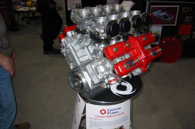 Сперва его крохотная фирмочка Cyclone Power Ltd. разработала и начала продавать 8-цилиндровый мотор Y40R. Возможно, он не стоил бы отдельной заметки — тем более, что здесь всё по обычному для таких моторов сценарию: цилиндры и головки от спортбайка Yamaha надеты на самодельный алюминиевый картер с 90-градусным развалом.