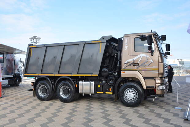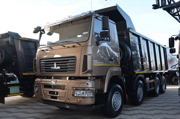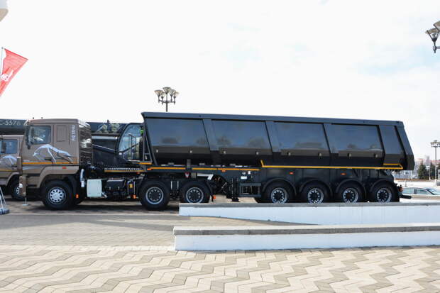 У МАЗа, как и у нашего КАМАЗа, есть собственные филиалы по производству надстроек и даже прицепного состава. Так, на выставке представили собственный полуприцеп-тяжеловоз, этакого конкурента нашему Тонару. Четырехосный трейлер с двумя подъемными осями рассчитан на перевозку груза массой до 41,6 тонны. Однако наши перевозчики вряд ли этим ограничатся: при объеме кузова в 38 кубов песка, к примеру, уместится 53 тонны.