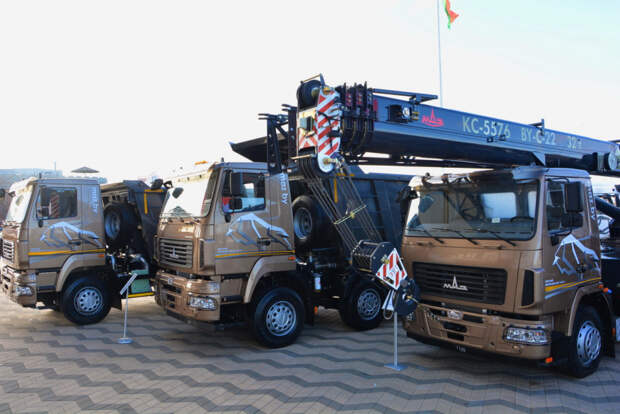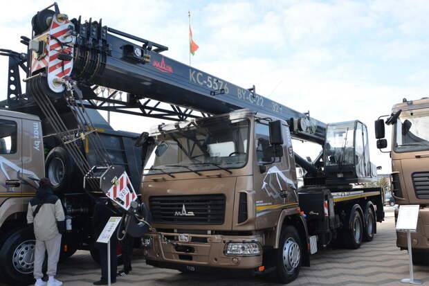 Входящий в объединение завод Могилевтрансмаш показал свой очередной 32-тонный кран. Первый образец этого крана был построен на полноприводном шасси, теперь же появилась версия на шасси 6х4. Так что и в этом сегменте конкуренция с отечественными производителями усиливается.