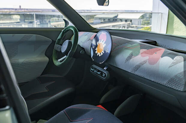 Знаковый элемент MINI в виде флага «Юнион Джек» можно увидеть на крыше, на панели спереди, а также в задних фонарях, в которых упрощенные элементы флага выполнены в виде стрелок. Упомянутый круглый дисплей по центру передней панели выполняет и функцию «приборки», и экрана информационно-развлекательной системы.