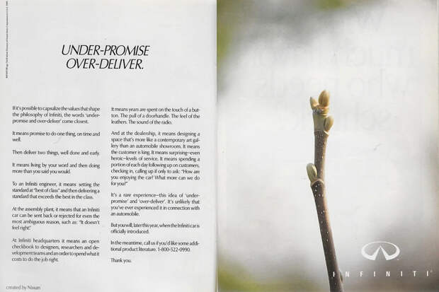 Концепция Total Ownership Experience от Infiniti вывела уровень отношений клиент-бренд в стратосферу. Персональные менеджеры, подменные автомобили, помощь в дороге в формате 24/365, компенсация за отели и транспорт в случае, если поломка машины произошла вдали от дома, эксклюзивные предложения по кредитным продуктам и трейд-ину. Не спорим, многое из этого существовало и до 1989-го. Просто именно Infiniti идеально сложил отдельные кусочки в большой пазл клиентоориентированности. В дальнейшем Infiniti Total Ownership Experience спокойно и без суеты скопипастят все премиальные бренды.