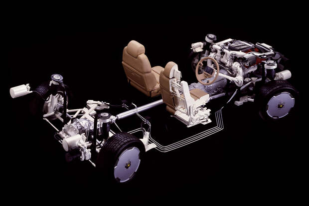 Многорычажная независимая — по образу и подобию огненного 300ZX — подвеска по кругу это, на секундочку, стандартная комплектация. В качестве допоборудования для Q45 предлагалось High Capacity Actively Controlled Steering (HICAS) — то самое полноуправляемое шасси. Другая знаковая опция — активная подвеска c десятью управляемыми компьютером датчиками и гидравлическими актуаторами каждого колеса. Она эффективно подавляла поперечные крены и клевки кузова, по сути выполняя роль знаменитой «мерседесовской» подвески Active Body Control… за 10 лет до ее появления.