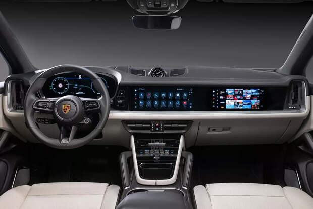 Интерьер Cayenne уже раскрыт: его Porsche раскрыла накануне на официальных снимках. Салон заметно освежили, установив дополнительный сенсорный экран диагональю 10,9 дюйма на передней панели перед пассажиром.
