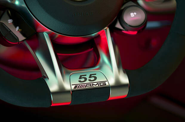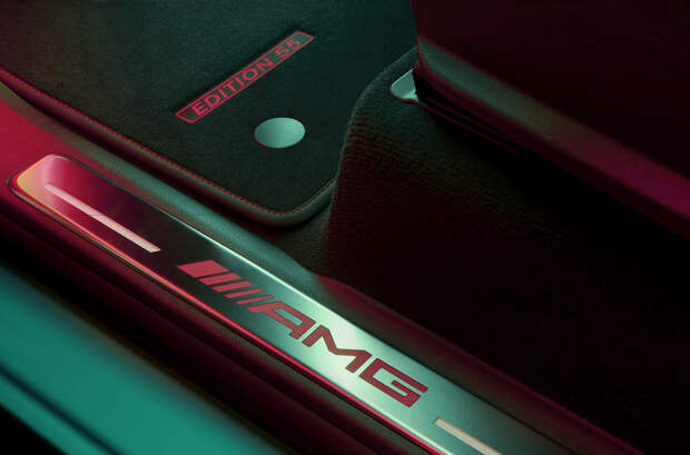 Салон спецверсии выполнили из кожи Nappa чёрно-красной гаммы. Контрастная палитра сочетается с матовыми углеродными вставками и шильдиками AMG «Edition 55» на рулевом колесе, выполненном из микрофибры, передней панели и велюровых ковриках.