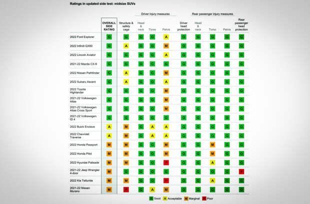Единственной моделью, которая получила оценку «плохо» стал четырехдверный Jeep Wrangler. Такой результат связан с отсутствием у внедорожника задних подушек безопасности. Кроме того, предельно допустимую оценку получили Nissan Murano, Kia Telluride, а также Hyundai Palisade и Honda Pilot.