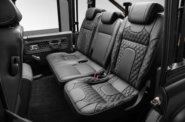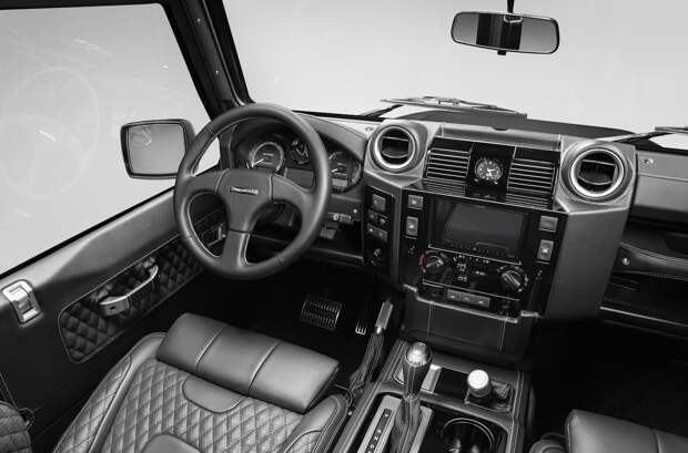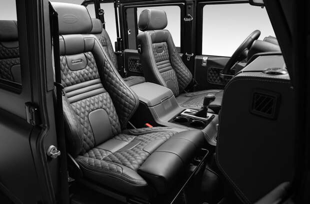 Кузов внедорожника выкрашен в черный колер Obsidian Satin Black. Колеса — 18-дюймовые легкосплавные Apollo, обутые в шины BF Goodrich. Передняя и задняя оптика собраны на светодиодах. Также на машине стоят зеркала с электроприводом и алюминиевые дверные ручки; решетка радиатора оформлена в стиле Defender SVX. Лебедка — Warn VR Evo с тяговым усилием 4,5 тонны.