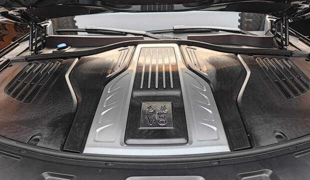 Под капотом — бензиновый мотор V8 4.0 с непосредственным впрыском и турбонаддувом. Он разработан концерном FAW совместно с Центральным исследовательским институтом Китая. У внедорожника мотор настроен на 360 л.с. и 500 Нм. В трансмиссии — восьмиступенчатый «автомат» ZF и полный привод с муфтой подключения передней оси (информации о «внедорожных» примочках нет).