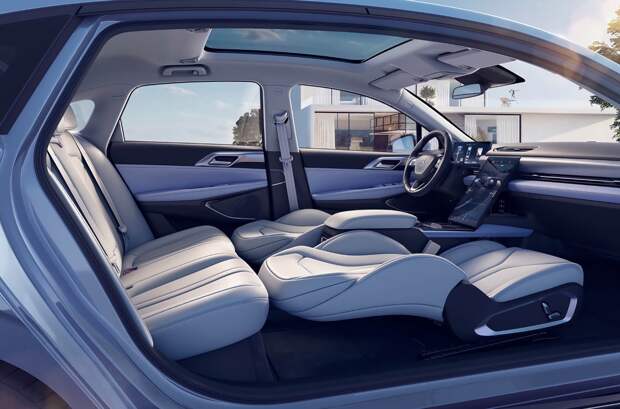 За мультимедийную часть отвечают вертикальный дисплей диагональю 15,6 дюйма и «приборка» на 12,3 дюйма. Есть голосовой помощник, WiFi/4G, панорамная крыша, четыре USB-порта, в том числе один USB-C, и беспроводная зарядка мощностью 15 ватт. Сюда можно добавить двухзонный климат-контроль с дефлекторами на втором ряду, три 12-вольтовые розетки, кресла водителя и пассажира с электрорегулировками и отделку кожзамом.
