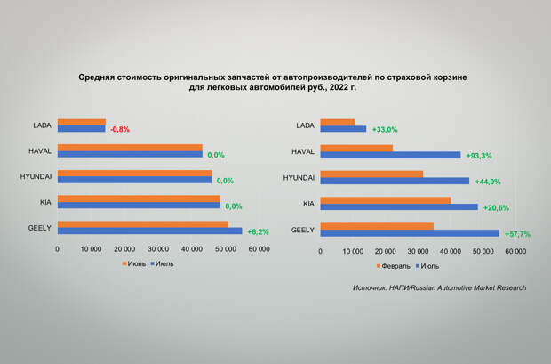 Эксперты изучили цены на запчасти Lada, Haval, Geely, Kia и Hyundai — марок, которые по состоянию на середину года наиболее востребованы на российском рынке. В процентном соотношении заметнее всего подорожали оригинальные детали для автомобилей Haval — рост составил 93,3 процента в период с февраля по июль. Запчасти для Geely стали дороже на 57,7 процентов, Hyundai отметился подорожанием почти на 45 процентов, а Kia — на 20,6 процента.