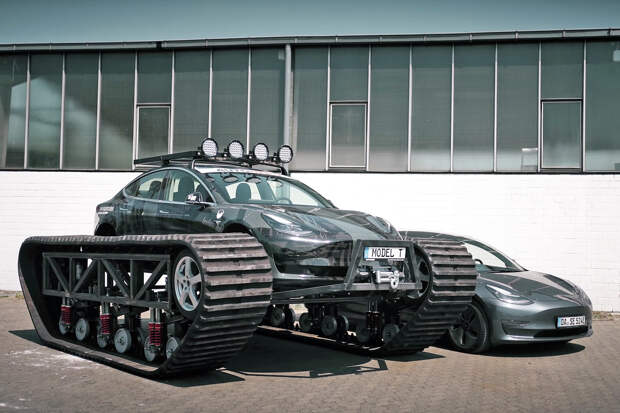 Немецкие блогеры с You-Tube-канала The Real Life Guys решили приспособить Tesla к бездорожью. И для этого они избрали радикальный способ: новенькой Model 3 приделали гусеничные ленты, каждая из которых весит примерно 1,3 тонны. В результате электромобиль превратился в экстремальный оффроудный «танк» общей массой порядка шести тонн.