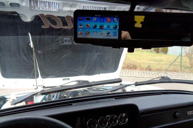 Внутри Лада вообще ни на шаг не отступает от колхозных канонов. Шеренга дополнительных приборов, спортивный руль Momo, которые так любили ставить в Жигули девяностых, перешитый интерьер с ковшами, электростеклоподъемники и даже интерактивный экранчик с Алиэкспресс в зеркале заднего вида. В него зачем-то зашиты видеоплеер и даже калькулятор.