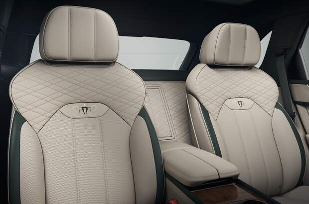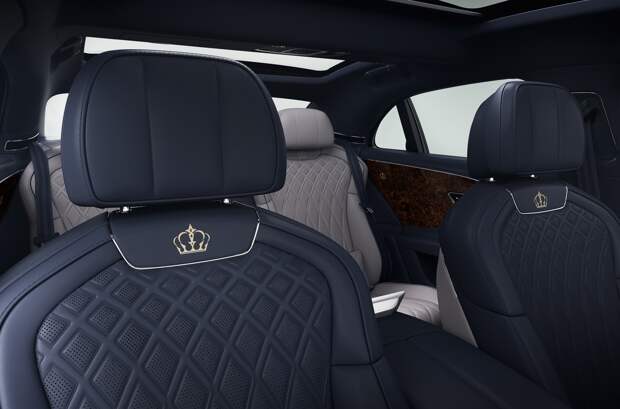 Четырехместный салон цветом разделен на две зоны: спереди используется синяя кожа Imperial Blue, сзади — изготовленная на заказ серо-голубая Baroda Blue. Последняя напоминает обивку королевских лимузинов. Другая специфическая деталь — два типа шпона: с отрытыми порами и под глянцевым лаком.