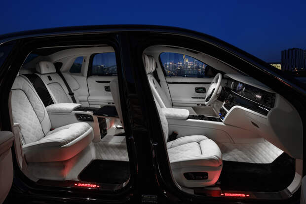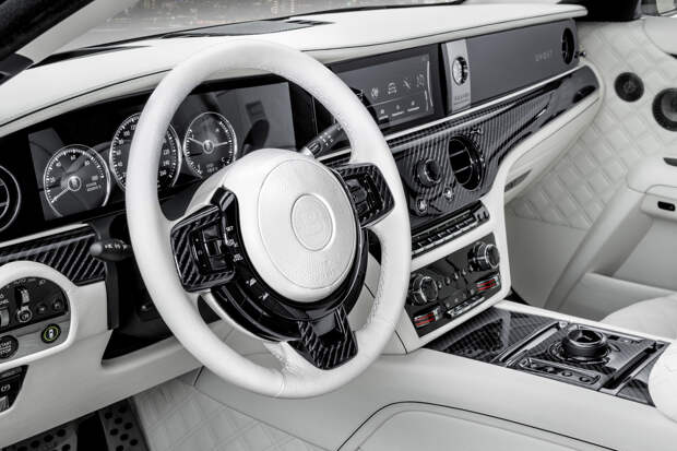 Интерьер демонстрационного автомобиля Rolls-Royce полностью перешит в белую кожу, дополненную углепластиковыми декоративными вставками и карбоновыми накладками на пороги с подсветкой. Также предусмотрены накладки на педали из нержавеющей стали, обшивка потолка алькантарой и возможность оформить салон любыми сочетаниями материалов любых цветов по вкусу заказчика.