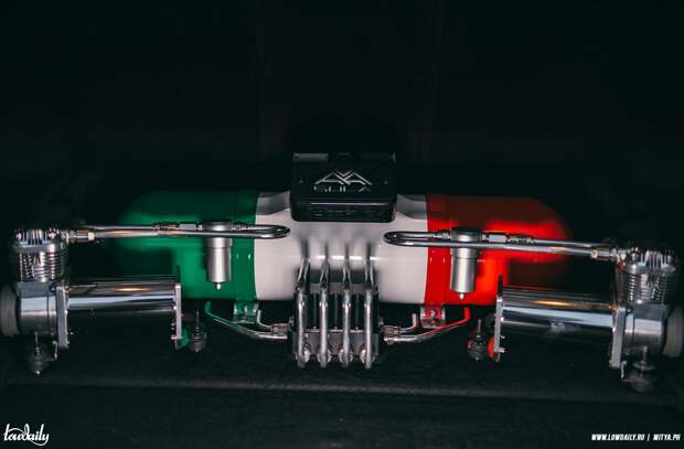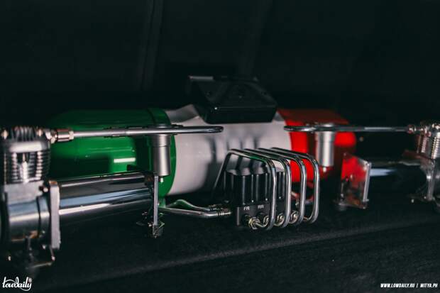Вы не поверите, но в этот кузов влезли кастомные диски 11j с вылетом 15 — сами удивлены. Центра покрыты браштом под прозрачным лаком — красивое, универсальное решение. Пневма на базе койловеров и системы Sula от AceOfAce — жирный сетап на долгие годы.