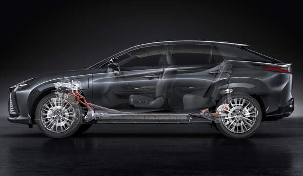 Кроме того, по сравнению с исходной Тойотой новому Лексусу заметно увеличили свесы кузова, поэтому габаритная длина выросла с 4690 мм до 4805 мм. Бензиновый Lexus RX всего на 85 мм длиннее. Ширина электромобиля — 1895 мм, высота — 1635 мм. На выбор предложены колеса диаметром 18 или 20 дюймов.