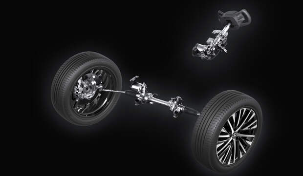 Электрическая платформа e-TNGA спроектирована по современным канонам: у нее компактные унифицированные моторные модули (со встроенными инверторами и редукторами), а расположенная под полом тяговая батарея интегрирована в силовую структуру кузова. Передняя подвеска — типа McPherson, сзади — двойные поперечные рычаги, причем RZ стал первым Лексусом с амплитудозависимыми амортизаторами.