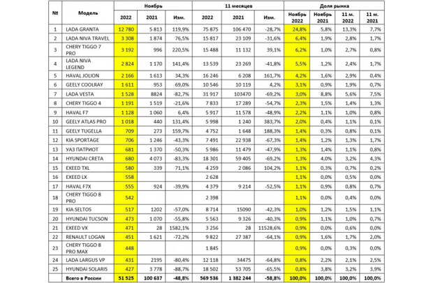 Топ-25 моделей на рынке новых легковых автомобилей в ноябре 2022 года (шт.)