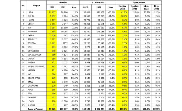 Это сразу на 19% больше, чем в октябре, когда на учет встало только 43308 новых машин. Впрочем, если сравнивать с результатом ноября 2021 года, то спрос все равно упал почти вдвое (на 48,8%).Топ-25 марок на рынке новых легковых автомобилей в ноябре 2022 года (шт.)