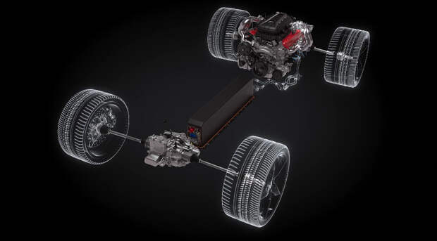 Городить привычную трансмиссию 4х4 инженеры не стали, вместо этого использована гибридная силовая установка с раздельным приводом осей (eAWD): задние колеса вращает бензиновый двигатель, а на передней оси установлен единственный электромотор. Подобная схема «разделения труда» уже давно используется на гражданских гибридах, но в перевернутом виде — с электромотором на задней оси.