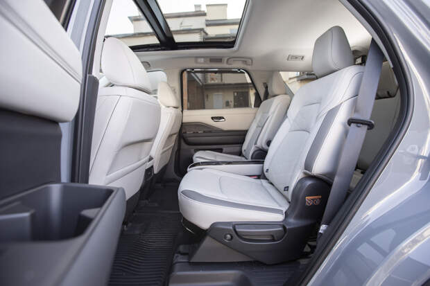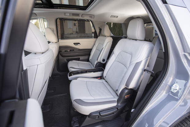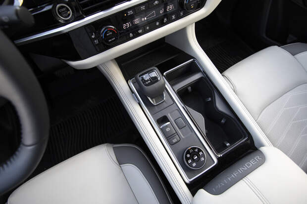 А по простоте и удобству проникновения на третий ряд Патфайндеру вообще нет равных во всей индустрии — достаточно нажать кнопку на боковине подушки сиденья второго ряда (или клавишу-дублёр на тыльной стороне спинки), и кресло автоматически отъезжает вперёд, предоставляя широкий проход на «галёрку». Разумеется, положения сидений регулируются, а салон гибко и без усилий трансформируется. Перевозка больших коллективов и крупногабаритной поклажи — это то, в чём Pathfinder действительно компетентен.
