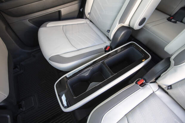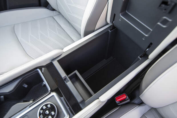 А по числу мест для размещения мелких вещей — наверное вообще рекордсмен. Одних только подстаканников на трёх рядах я насчитал 12, и это не считая ниш под бутылки в дверях. Даже удивительно, что при таких широких возможностях снабжения напитками на борту не предусмотрен биотуалет. Плюс просторнейший бокс между двумя раздельными задними креслами (как же все любят их называть «капитанскими»), двухъярусное размещение мелочёвки в центральной консоли спереди, огромный ящик внутри подлокотника и полочка над бардачком — обзавидуется большинство минивэнов!