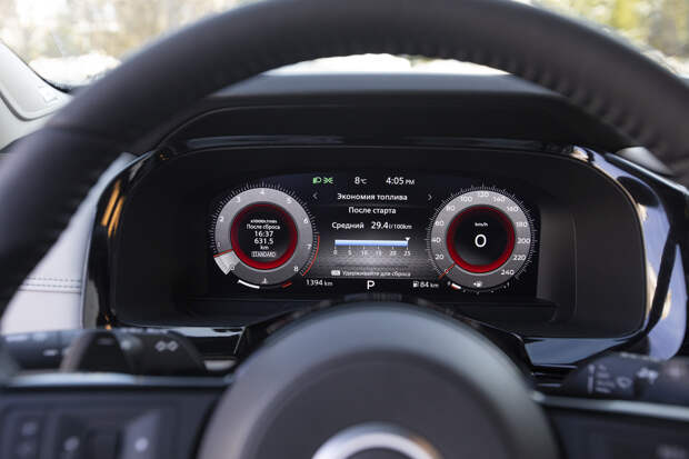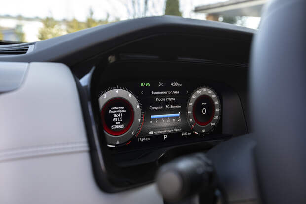 А вот приборная панель удалась: по дизайну напоминает фольксвагеновскую, информативна и отлично читается. Разве что иногда скачет адаптивная яркость дисплея, пытаясь следовать за меняющейся освещённостью. А климат в попытках подстроиться под внезапно вышедшее из-за облаков яркое солнце вообще сходит с ума: в авторежиме и при заданных 23 градусах дует с громким свистом ледяным воздухом так, что на руле мёрзнут руки! И усмирить это морозное дыхание доступными органами управления совсем не просто.
