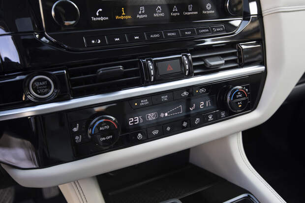 Мощная харизма во внешности находит продолжение и в интерьере. Он не такой интеллигентный (ладно, честнее сказать — непритязательный), как у Volkswagen Teramont, и не такой утончённо-уютный, как у Mazda CX-9. Но от него веет основательностью и добротностью в стиле Toyota Land Cruiser. Прежде всего, благодаря внушительным размерам отдельных элементов: например, теннисного корта центрального подлокотника или футбольного поля передней панели под лобовым стеклом.